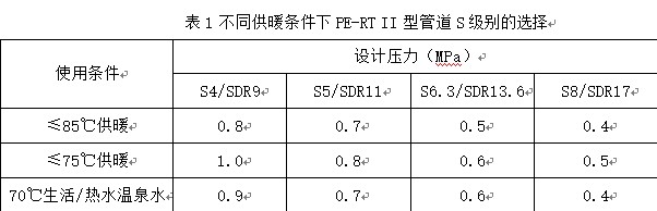 在中國,采暖方(fāng)式(shì)的選擇是根(gēn)據建築類型和所在地區的氣象條件、能源狀況以及技術經濟等情況的比較來確定的。通(tōng)常,一年中累計90天以上日平均溫度(dù)低於5℃的(de)地區,宜采(cǎi)用集中供暖;實際應用中,二次管網的熱水經過換熱站之後通常溫(wēn)度都不太高。如果戶內采用散熱(rè)器采暖,供回水溫度約為60-80℃,運行壓(yā)力基本在0.8MPa以下,根據《Ⅱ型耐熱聚乙烯(PE-RTⅡ)低溫直埋供熱管(guǎn)道設計與施工規(guī)範》DB37/T 5021-2014 的規定,按照50年的(de)設計要求,在不同的供暖條件下PE-RT II型管(guǎn)道的承壓能力及(jí)S級別選(xuǎn)擇見表1
