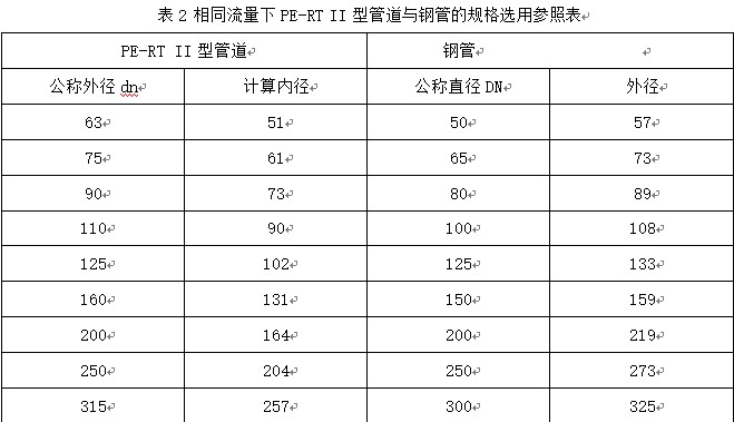 II型管道(dào)與鋼管的規格選型見表(biǎo)2