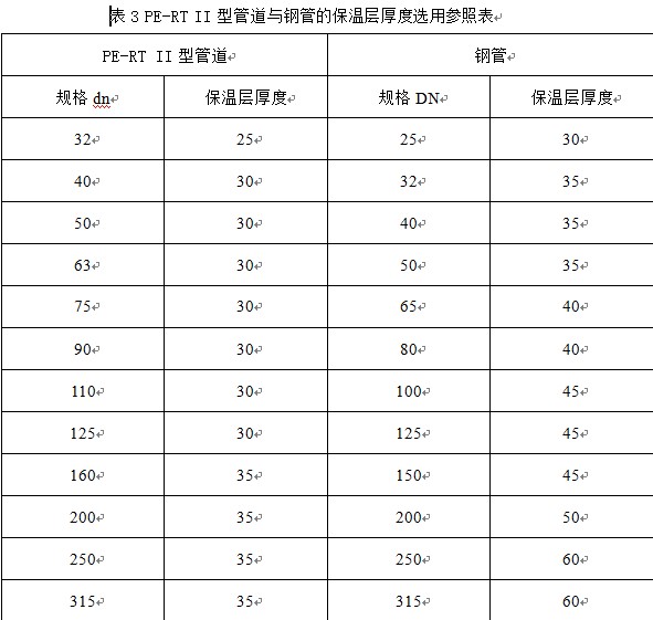 PE-RT II型供熱(rè)管道與鋼管相同,都采用工作管、保溫層(céng)、外護管三位一體的保溫結構,由於PE-RT II型材料的導熱係數為鋼管的1%,即管材本身具有較好(hǎo)的保溫性能,且PE-RT II型(xíng)管道、保溫層、外護(hù)管的熱膨脹係數基(jī)本一致,會成為一個整體,不易分層、脫落,管(guǎn)道保溫效果優於鋼管,在相同的外界溫度條件下(xià),更節(jiē)約保溫(wēn)材料。以輸送80℃熱水為例,相同流量(liàng)的外界溫度下,PE-RT II型管道與鋼管的保(bǎo)溫層厚度選型見表3