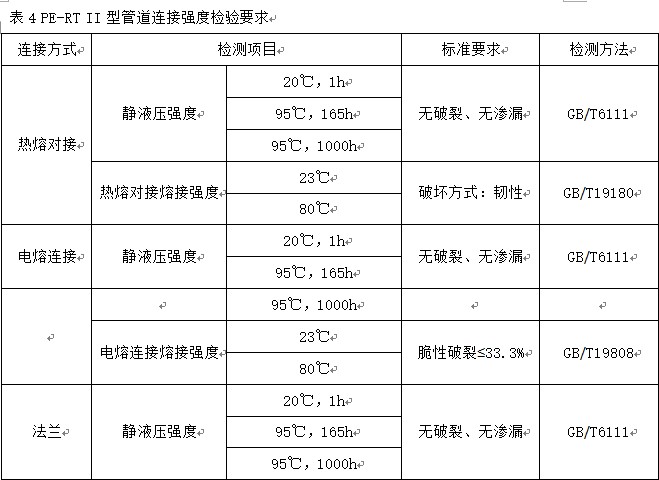 PE-RT II型(xíng)管材、管件參照GB/T28799-2012執行,管(guǎn)道連(lián)接強度要(yào)求(qiú)詳見表4