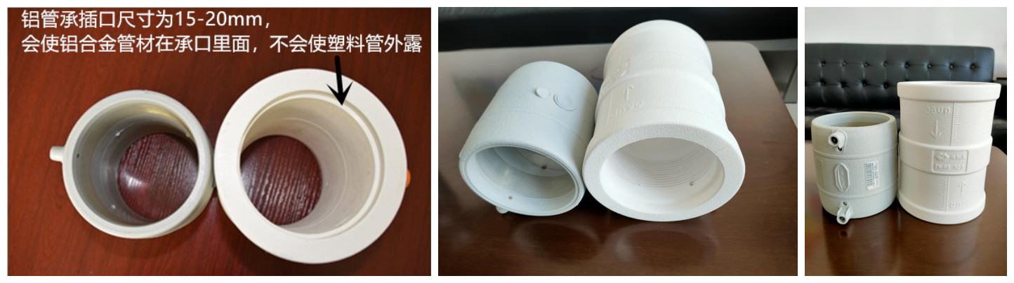 2)管件S2.5係列(liè)產品、承壓為2.5Mpa,管件兩端(duān)口部(bù)承口尺寸(cùn)為15-20mm,永遠會使鋁合金(jīn)管材在承(chéng)口裏麵,不會使塑料管外
